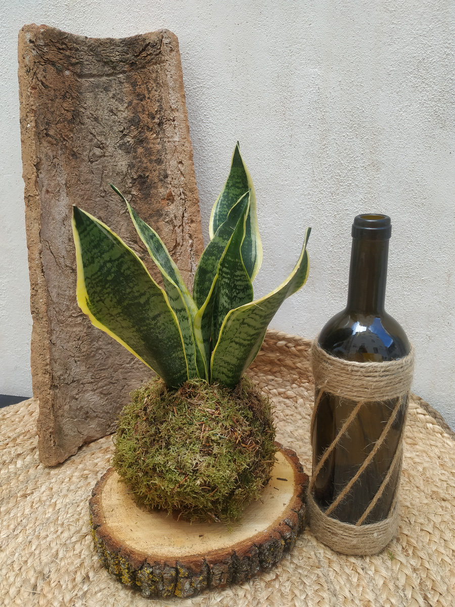 En esta bola de musgo tienes una Sansevieria, conocida como Lengua de suegra ,lengua de tigre, espada de San Jorge, etc… Es originaria de África. Planta resistente que exige poca atención. Perfecta para principiantes que buscan una compañera de piso fácil de cuidar.